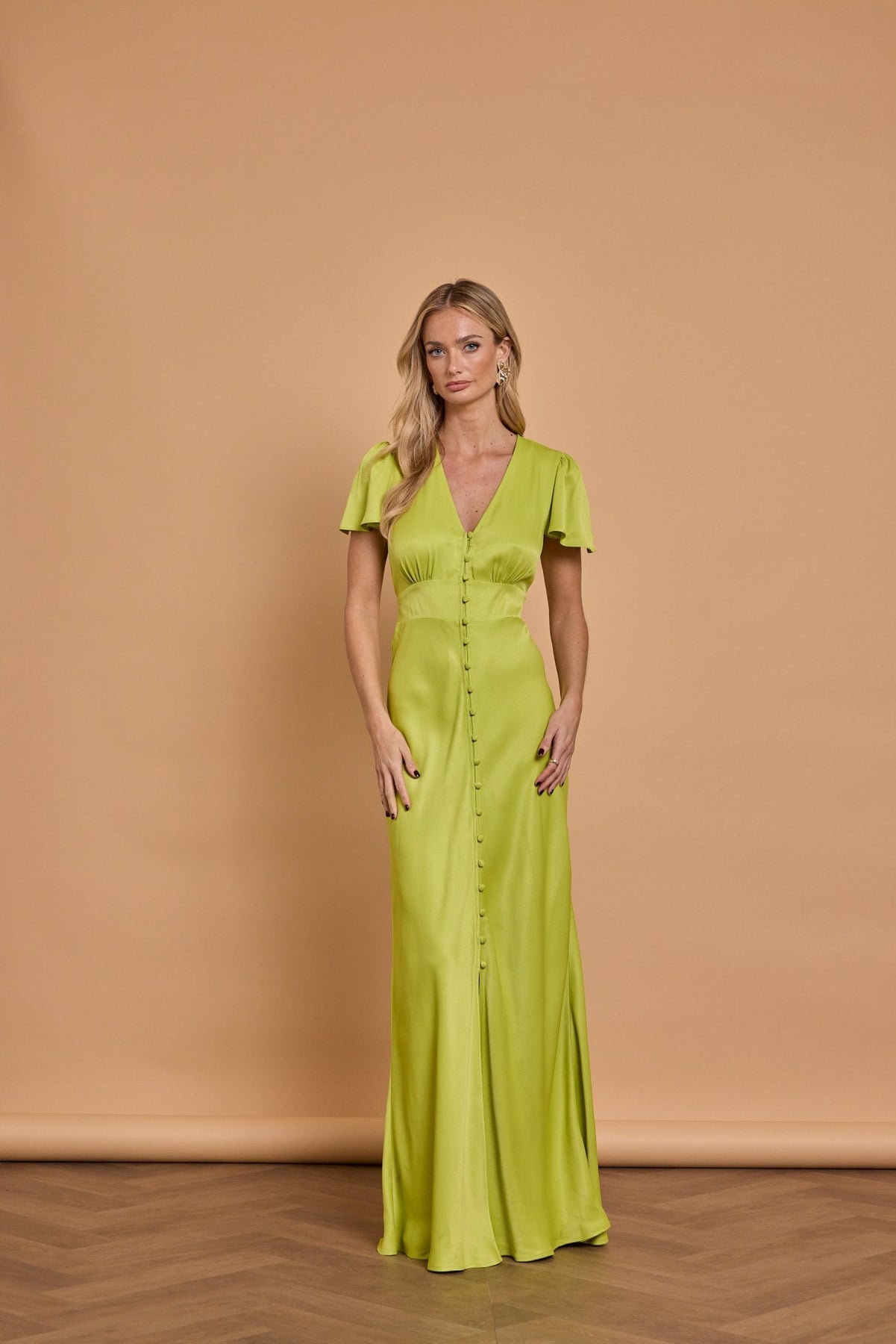 The Chelsea Lime Green bridesmaid dress is part of the satin collection. It is one of our new designs and a different take on the ever popular Daphne dress. The charming Chelsea dress features a button down front with a central split at the bottom. The cap sleeve is super pretty and compliments the V neck. There is a tie back feature which makes it easy to fit.