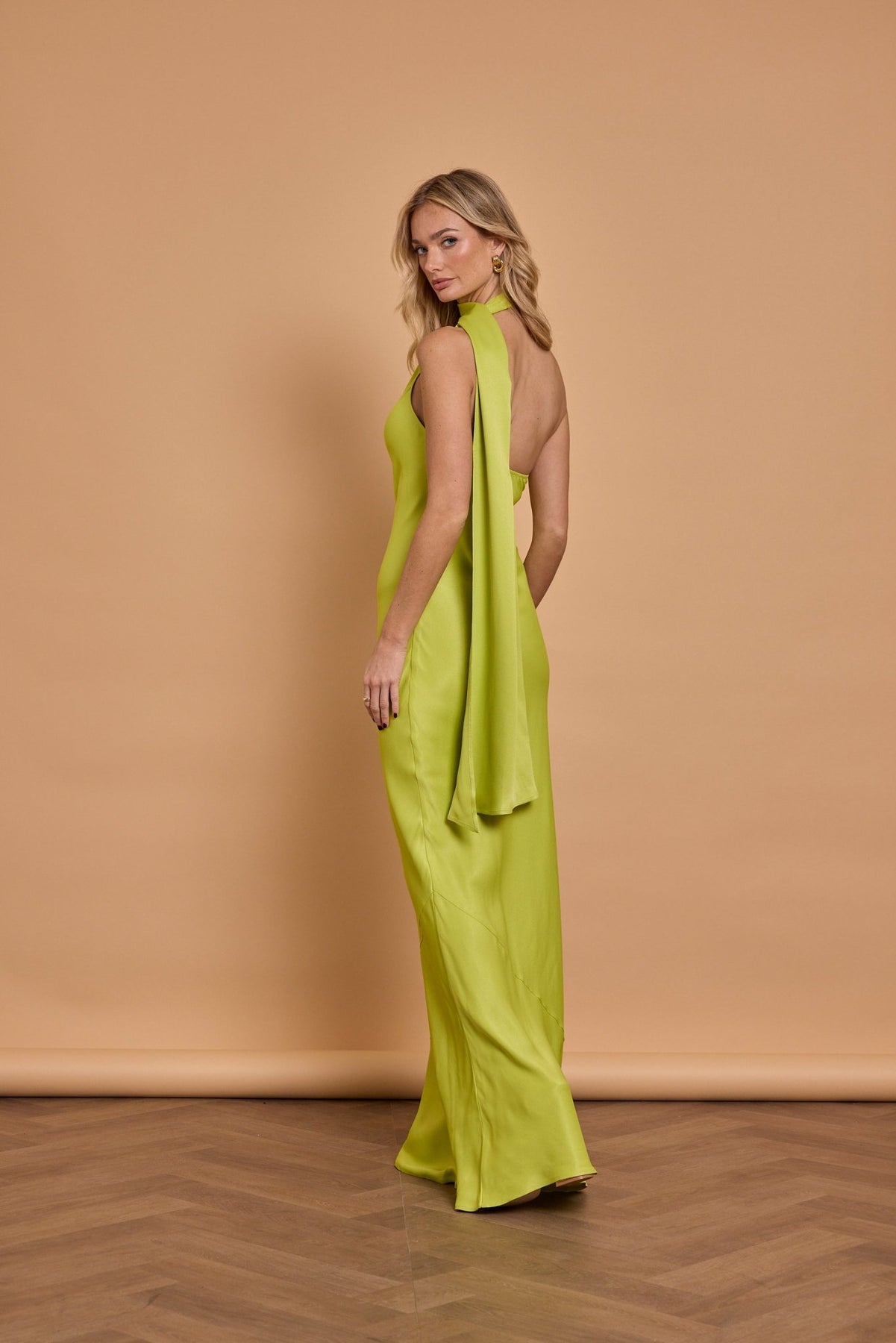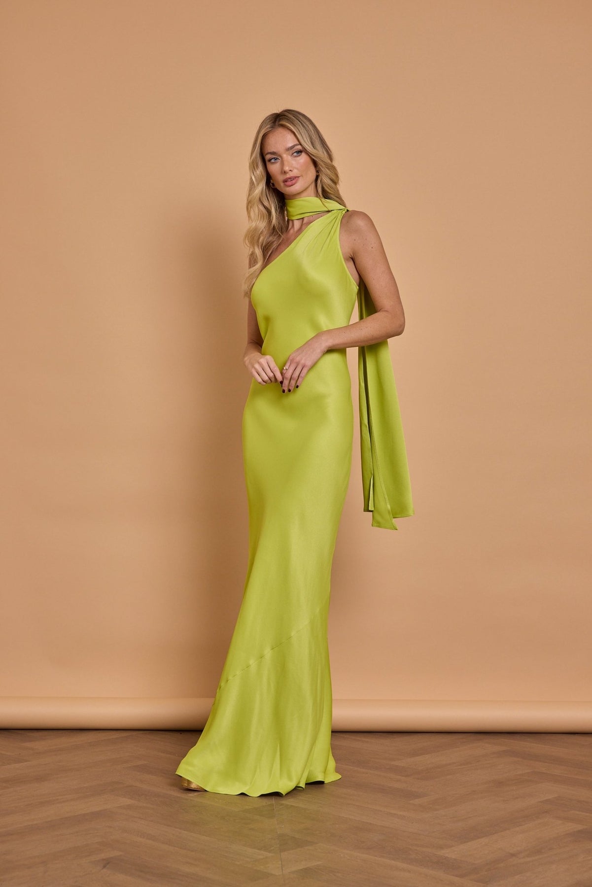 An asymmetric slip dress with a statement neck tie and a bias-cut skirt. Crafted from our premium matte satin, she has a subtle sheen that adds to her allure.