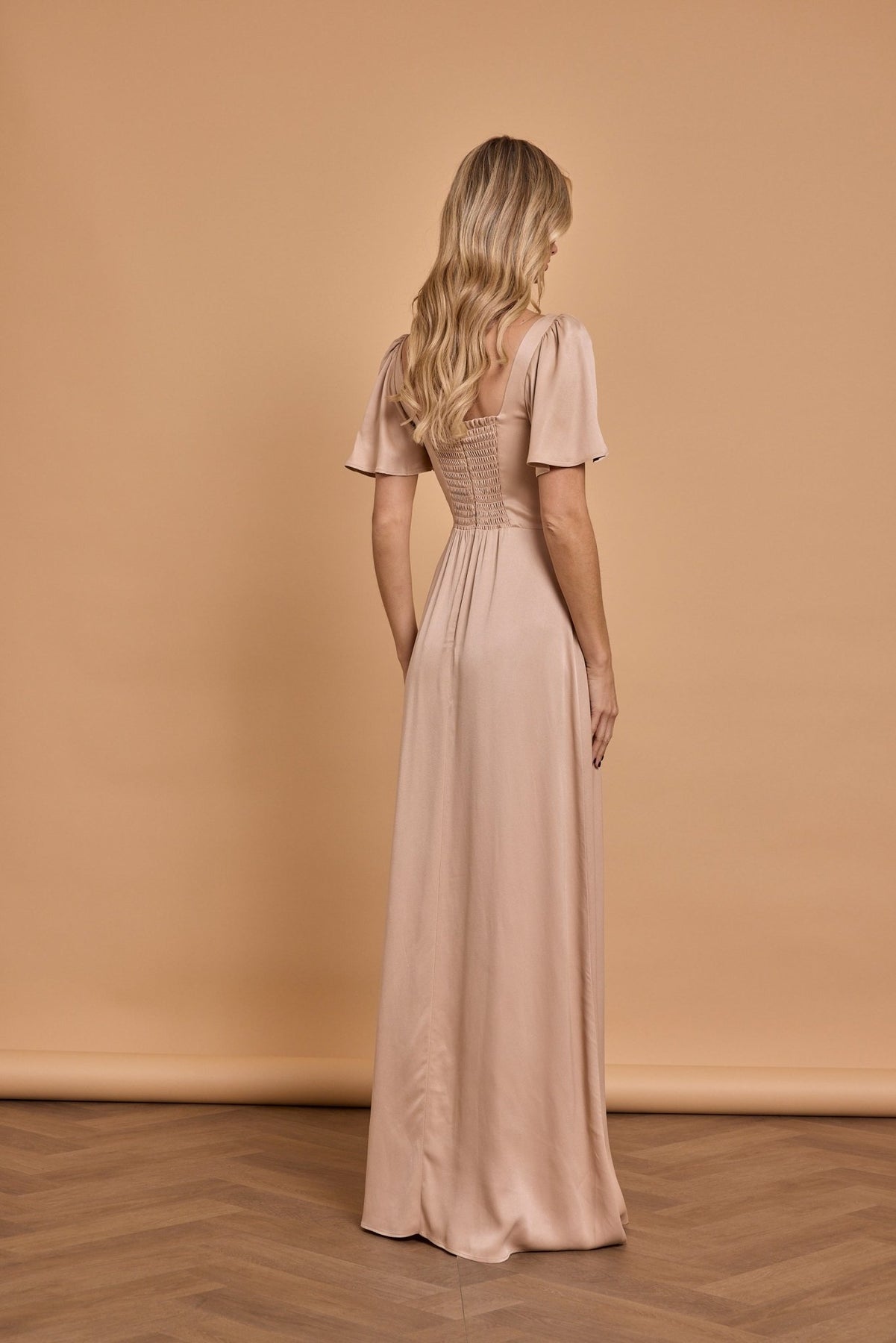 The Clemmie Mocha dress is part of the new satin collection. The Clemmie dress has a cool, contemporary square neckline with cape sleeves and a shirred stretch back. This style is the sister dress to the Allegra for those that want a sleeve. Bra friendly and a full circular skirt for a super flattering fit, this design couldn't be easier to wear.